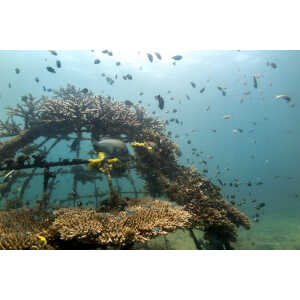 De foto toont een “kooi” met gered koraal erop.”© Ewout Knoester” Je ziet meteen al dat het allerlei vissoorten aantrekt.